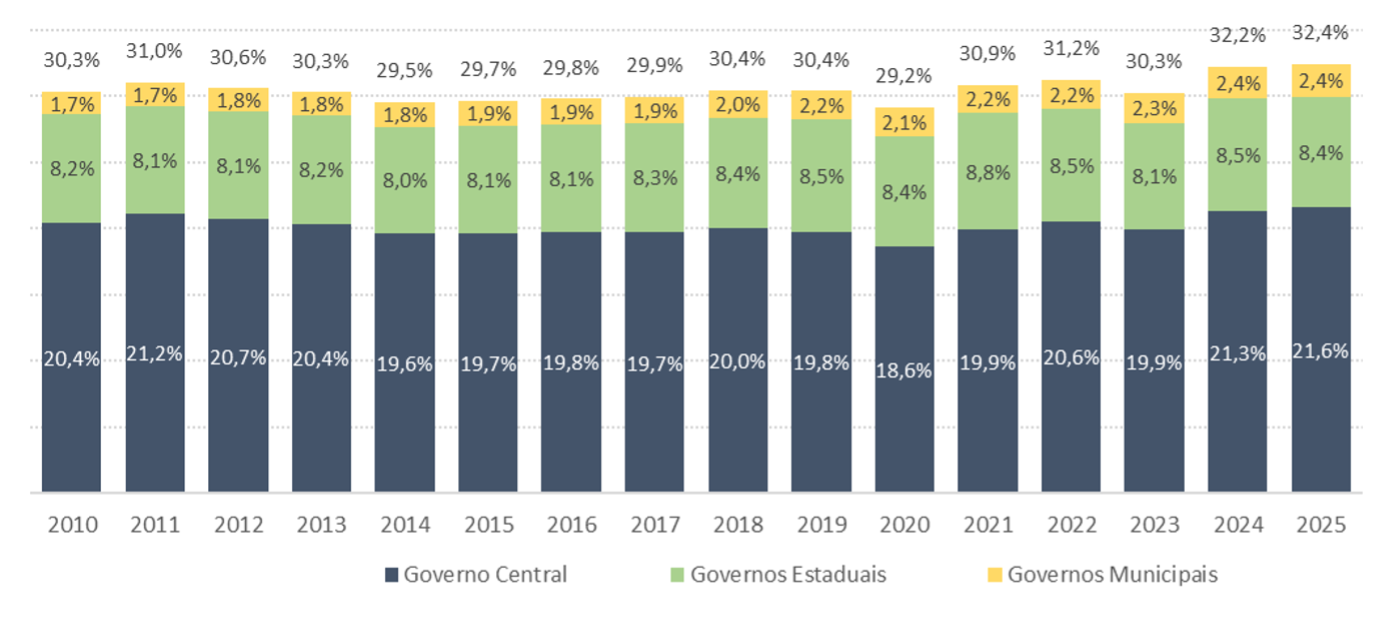 A carga tributária bruta do Brasil atingiu 32,4% do Produto Interno Bruto (PIB) em 2025, o maior patamar da série histórica iniciada em 2010, segundo dados divulgados pelo Tesouro Nacional. O indicador mede a proporção entre o total de tributos arrecadados pelas três esferas de governo e a riqueza produzida no país.